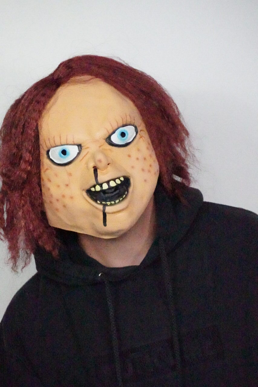 Each of our masks are molded, sewn, and airbrushed by hand. This is a really creepy Chucky mask with attached Hair. Just add a meat cleaver and this is a really creepy Halloween costume.